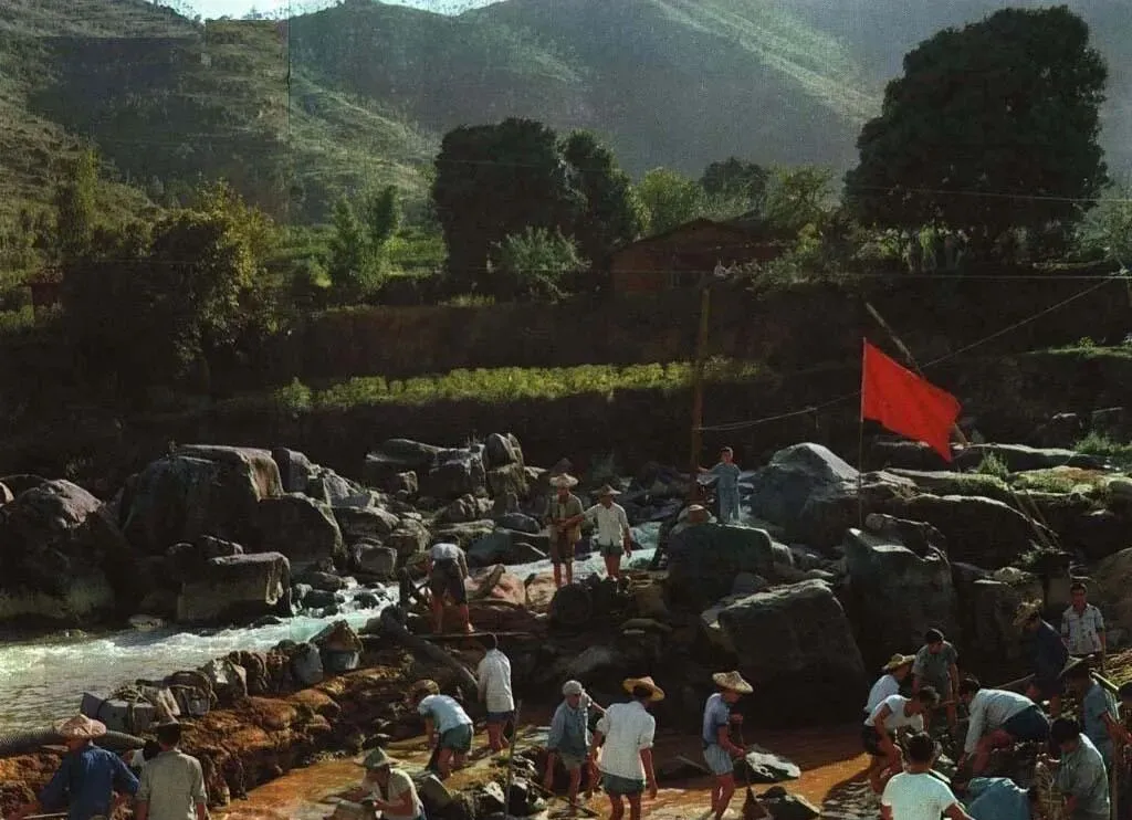 这个场面叫拦水修坝,条石一块块垒,水花打在小腿上冰凉刺骨,红旗迎风立着,哪家水桶漏了,邻队顺手就递一个,大家都想着先把水稳住。