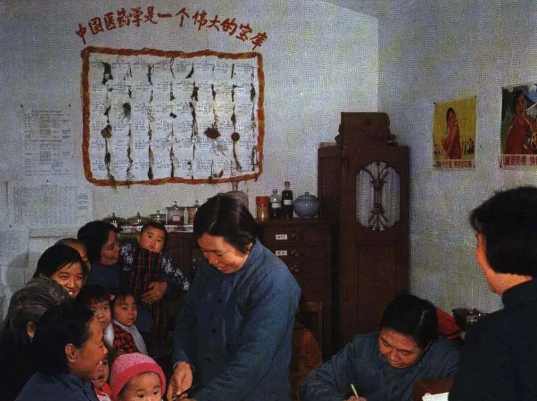 这个屋子是街道卫生站,墙上贴着药材图,桌上摆着小棕瓶,卫生员翻着花名册,一针扎下去,小孩噙着泪不哭,妈妈拍拍背说真勇敢。