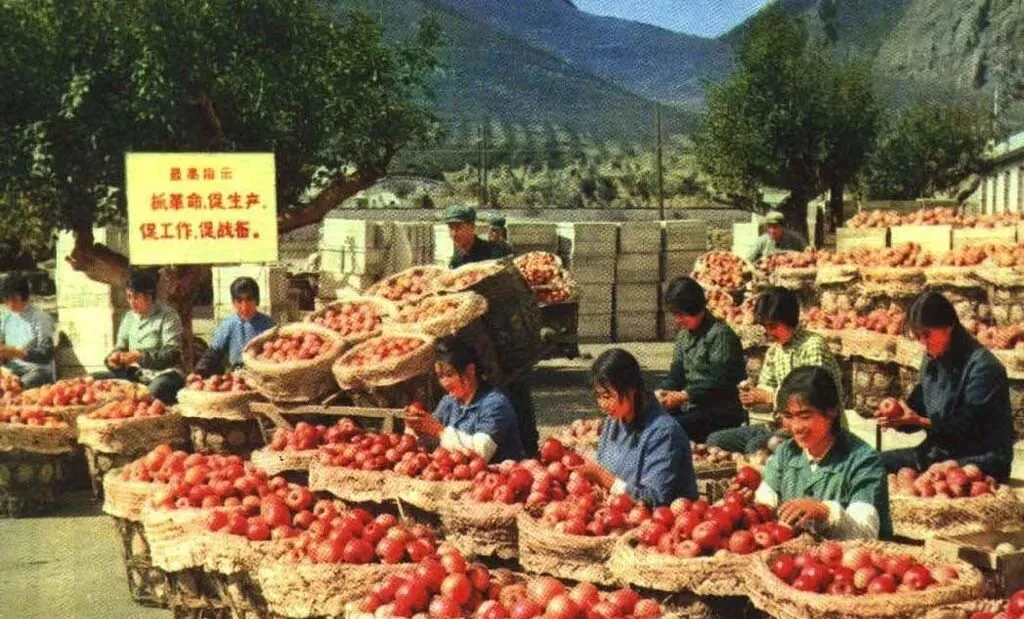 这些大筐是柳编框,里头垫着秸秆,红苹果堆得冒尖,女孩坐在筐沿挑拣瑕疵,手背被苹果皮磨得发亮,社里把最好的装箱,贴上纸标往外发。