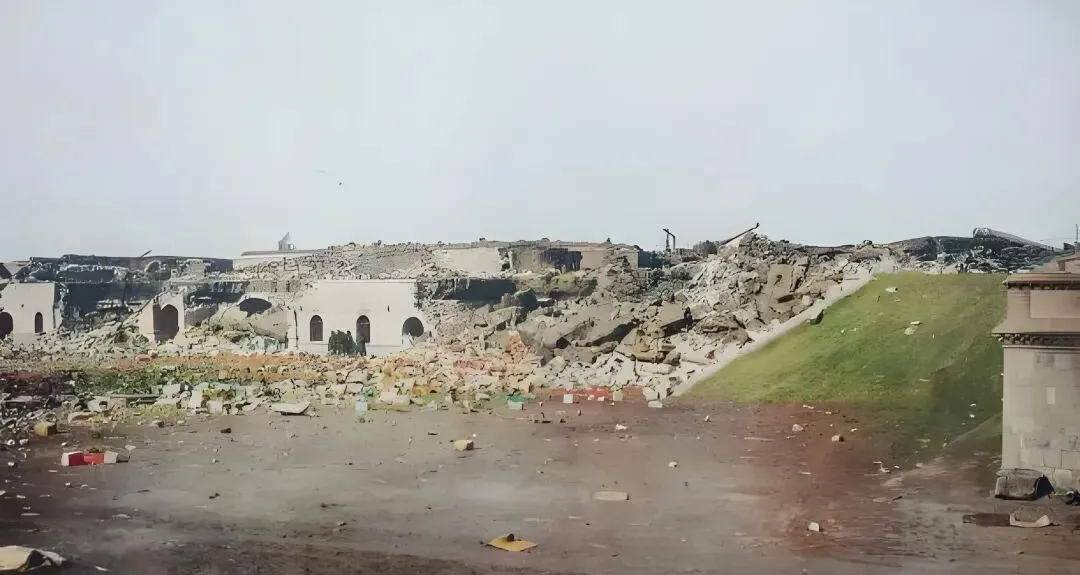 这片白墙拱洞曾是弹药库,前沿是弧形炮座和挡土墙,现在只剩碎石像潮水一样涌到脚边,远处还立着残缺的胸墙线,以前这里“面海设炮”,现在连方向都被炸没了。