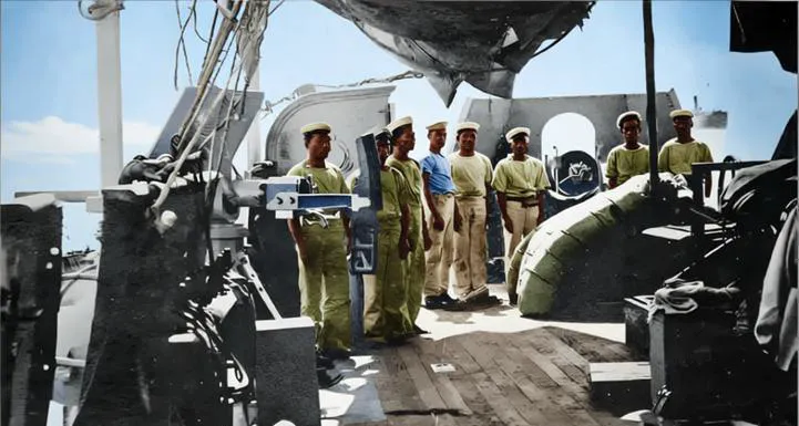 图中这门小家伙叫速射炮,炮架贴舷,甲板上铺着木条,几名水兵站成一列,手背在身后,帽檐压着眉骨,阳光被篷布切成几块,落在肩膀上,像提前打好的补丁。