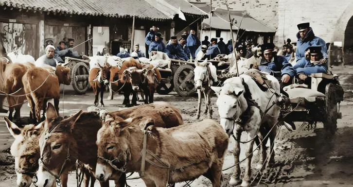这队车叫征用运输队,牛驴混编,缰绳细得像一根根针线,从兽口穿过去连着木轭,车上坐着披斗篷的兵,街口有个拱门,水坑里倒映着轮辐,真应了那句老话,打仗先打粮。