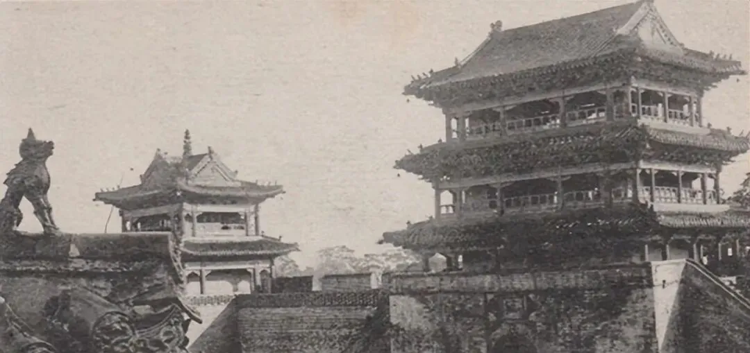 这座高挑的重檐楼阁叫方城城门,上头三层檐角挑得利落,城砖一块块码得紧密,券门上梭形影壁还在,远处有松枝从墙根探出来,像是要把楼压住一样,老照片里看不见守卫,却能想见当年的脚步在木板间空空作响。