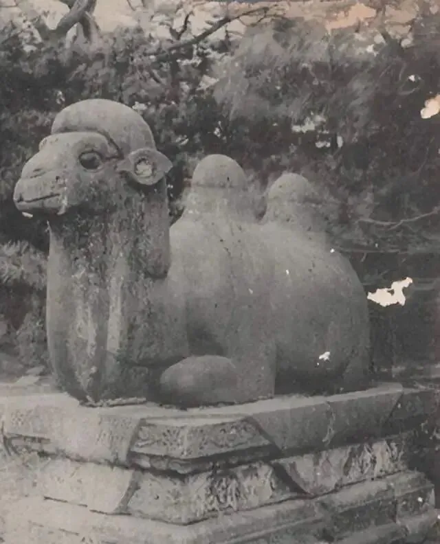 这个蹲在台座上的家伙叫石骆驼,双峰圆鼓,脑袋微微侧着,耳子小小贴在边上,石质被风雨打出斑点,样子却憨稳得很,驼铃听不见了,姿势还在,听爷爷说,昭陵神道上的石兽有文有武,骆驼属文值守,来往的人路过都要从它面前绕开一点,算是打个照面。