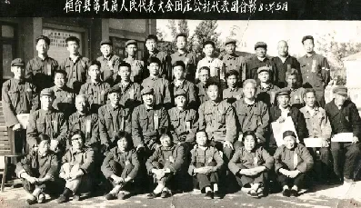 1980年5月,桓台县第九届人民代表大会田庄人民公社代表团合影。二排左一为时任田庄人民公社党委书记李乃星,左四为时任中共桓台县委书记胡安夫,左八为山东省劳动模范,原大庞大队党支部书记王守福。(照片提供人:殷佃平)