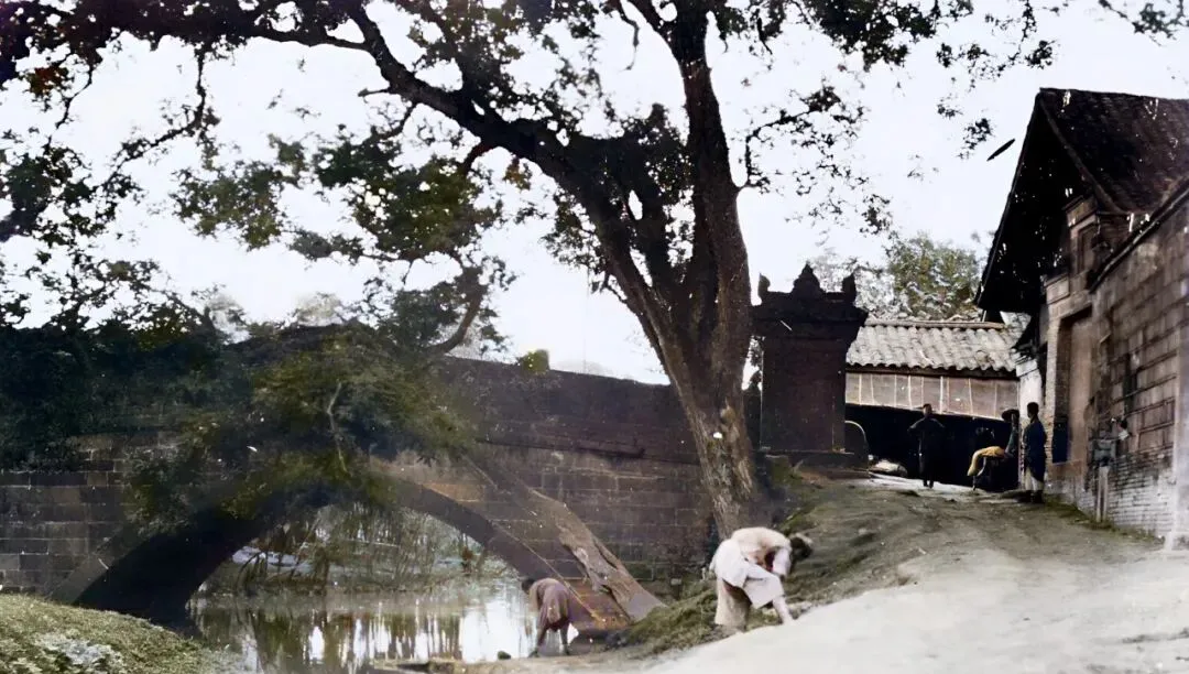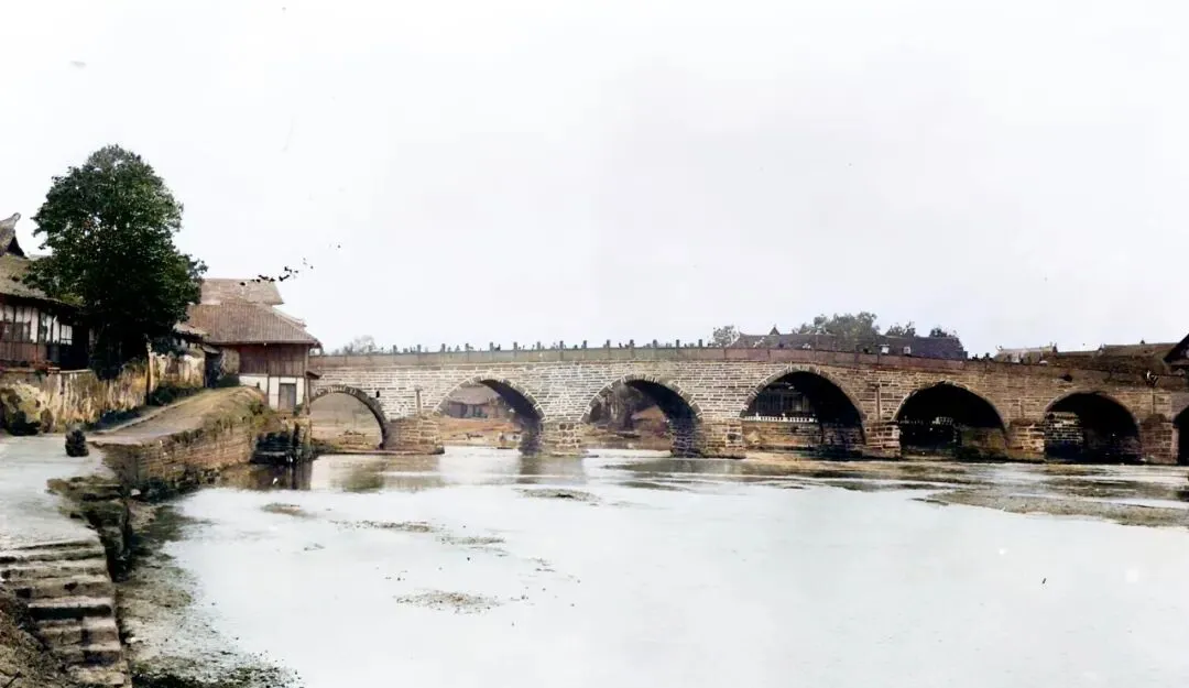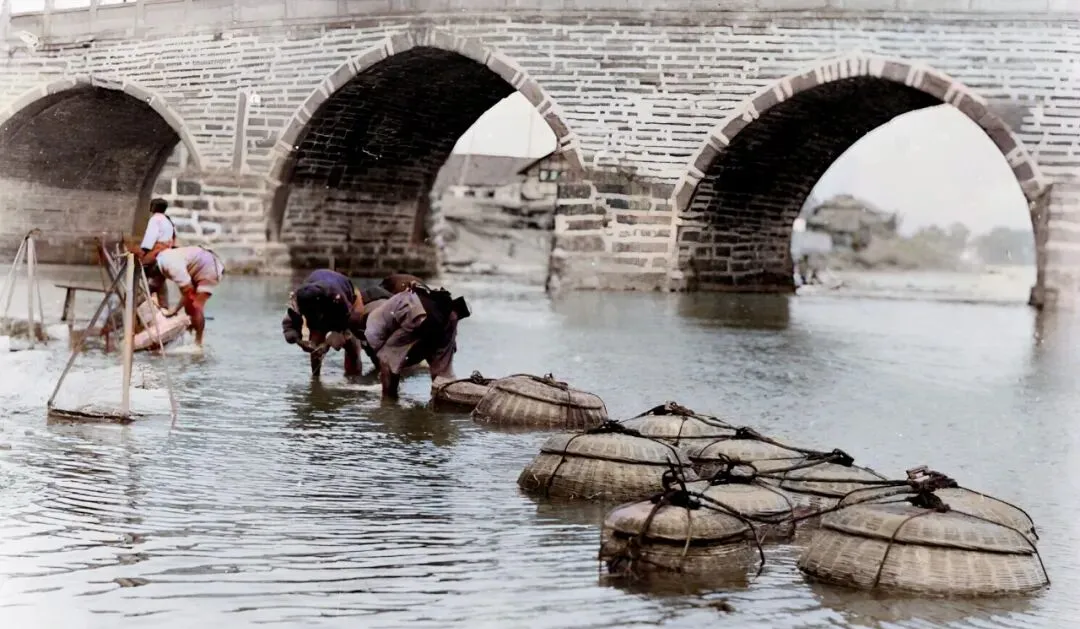 图中石拱桥是九眼桥,桥身砖缝清清楚楚,水边一溜竹编大笸箩,女人们卷起裤腿刷刷搓板,水花扑在袖口上亮晶晶,以前衣裳靠胳膊力气,现在哪家不是一台洗衣机省事。