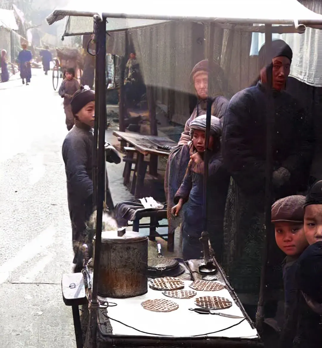 这个铁夹子叫饼模子,格子纹一压,面糊“滋啦”一声就结壳了,摊主旁边一口小煤炉冒着热汽,小孩儿盯着案板上的圆饼,两只手攥得直痒痒,我小时候最怕烫,偏要抢第一张出炉的。