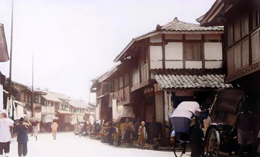 这个街市两边是穿斗木楼,白墙木格,屋檐压得低,门口晾着写着“号”的幌子,黄包车靠在柱子边歇气,掌柜端着算盘往外看一眼,喊人进来挑货。
