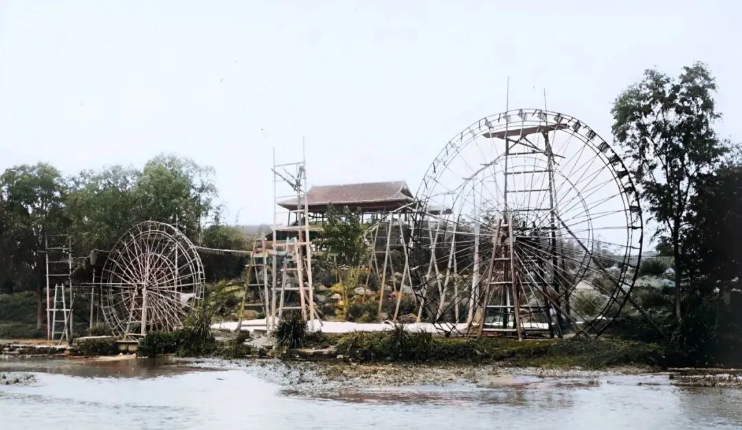 这一排圆轮叫水车,竹架子绑成,水舀子一只接一只,吱呀吱呀抬水上田,远远看像风在转,外公说以前靠它吃饭的庄稼人多得很,现在电泵一嗡,水来得更快。
