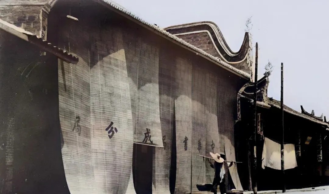 门口垂下来的就是遮阳竹帘,帘面写着“中华书局成都分局”,墨迹透在竹缝里,太阳一照,字像活的,一挑帘子,书香就扑脸了。