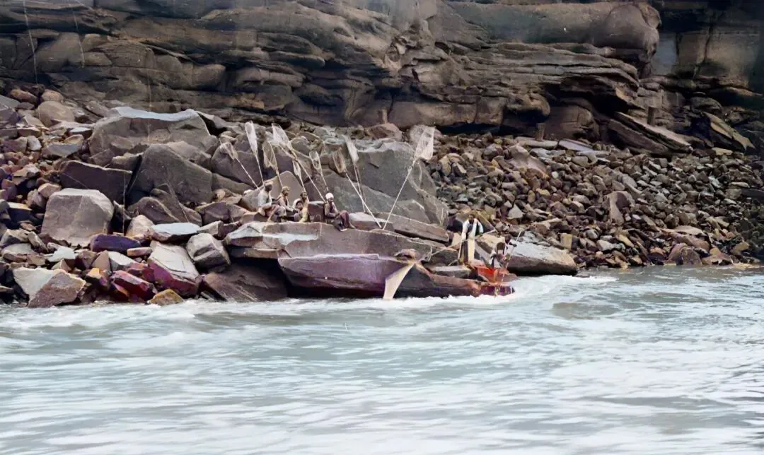 图中人坐在巨石上,长杆抄网一字摆开,网口贴着浪头,水一退就兜住活蹦的鱼,手一抖,银光往篓里跳,靠的是眼力劲儿,急不得。