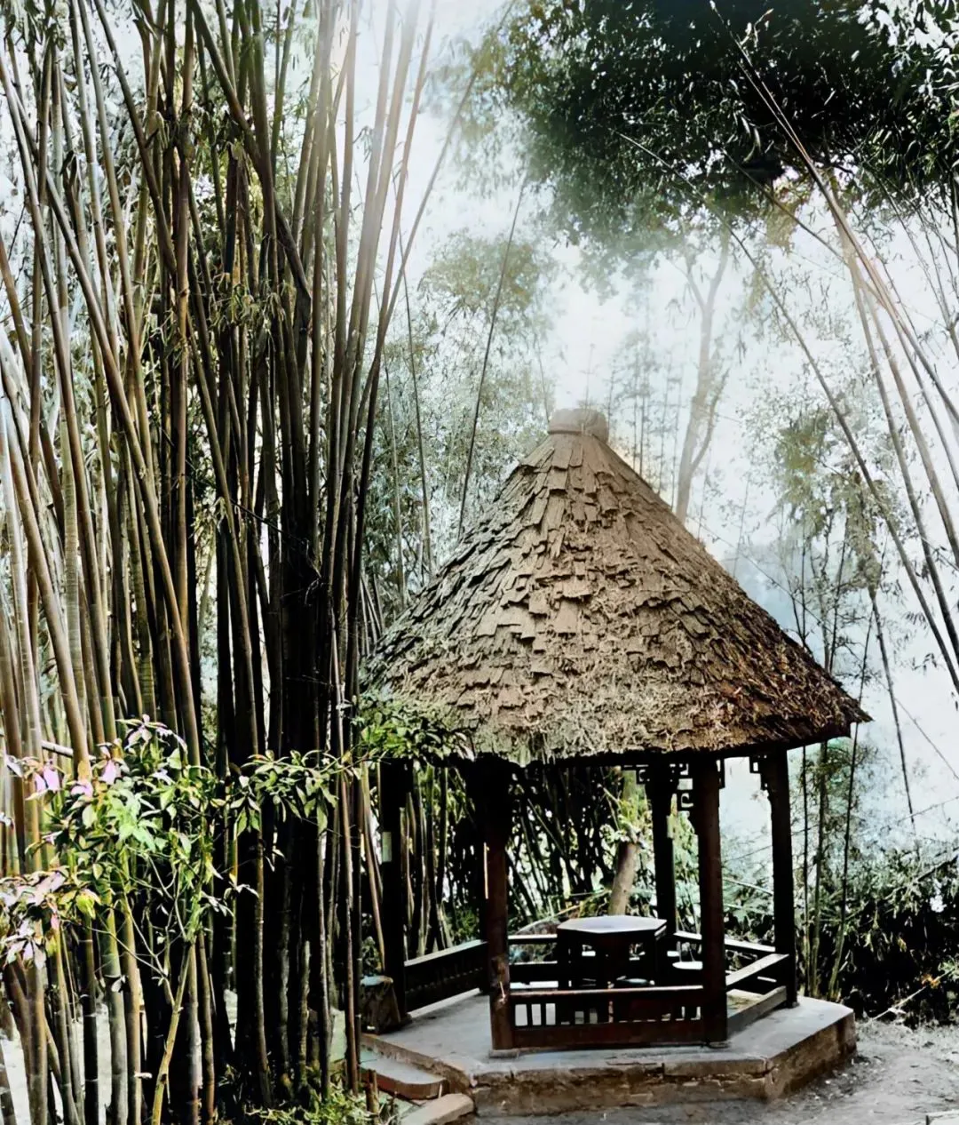 竹林里这顶草檐小亭,桌凳齐整,坐下摸一摸桌沿的木纹,潮气从指缝里往上冒,耳边全是叶子互相摩挲的声响,心里立马静下来了。