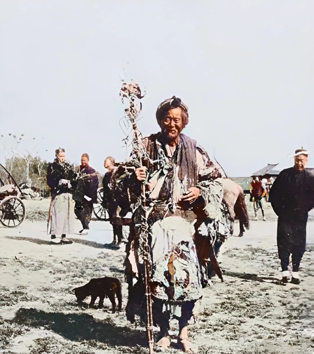 图中这位披挂着破袄条子的男子,老辈人管他叫乞丐帮头,也就是传说里的丐帮“帮主”,他手里的棍子不只是拄着走路的家伙,杆上缠着布条绳头铜铃,远远一晃就知道是本地的地盘,谁家办红白事儿,他带着人去维持秩序讨点口饭,算是规矩活儿,不是乱抢乱要那一套。