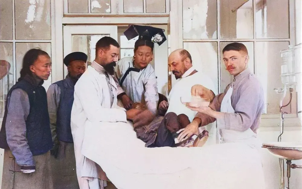 这个场景在老一辈口中叫洋医馆,小孩头上伤口在流血,几位洋医生忙着按住手脚消毒止血,屋里玻璃窗亮得刺眼,盆里是清水和纱布,动作麻利不带拖泥带水。