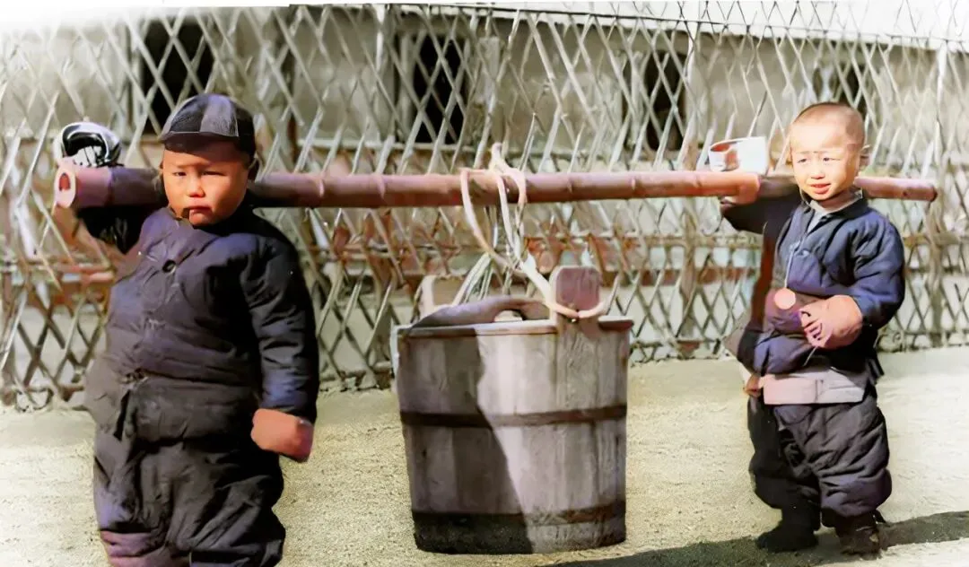 这两个小家伙抬着竹杠走,是孤儿院里的小差事,木桶空空,午饭后要把桶送回后院食堂,竹杠比人高一截,前头那位闷着不说话,后头那位边走边扭腰,脚下的棉鞋被土拍得油亮,阳光一照,袖口里露出线头,别提多真实。