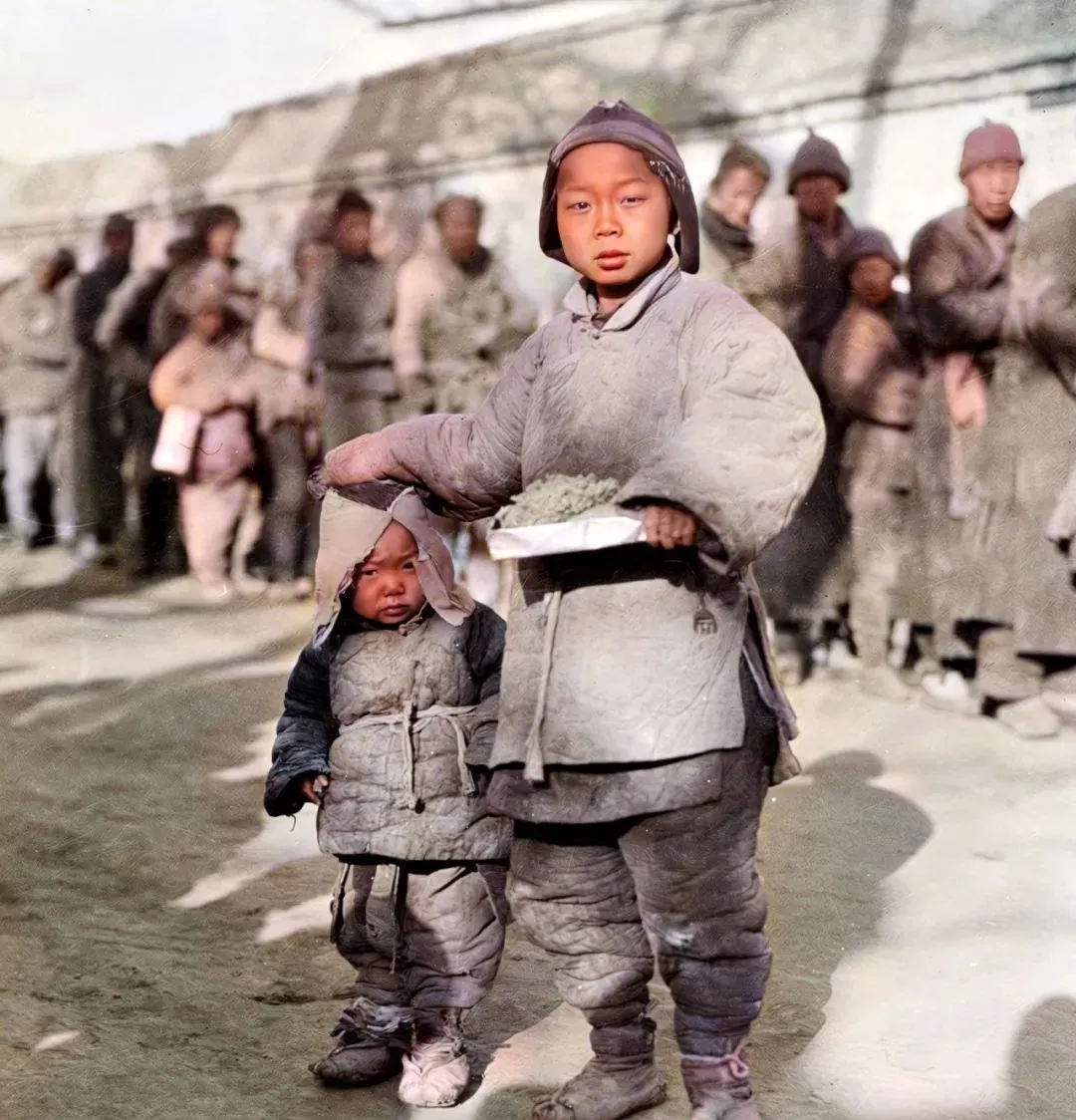 这个场面叫施粥,打粥的地儿往往把男女分开排队,老弱单拎一边,队尾有人敲梆子维持秩序,图里的哥哥端着个纸盒盖,里头是一团团白米饭,弟弟跟在旁边,帽耳耷拉着,眼神怯生生的。