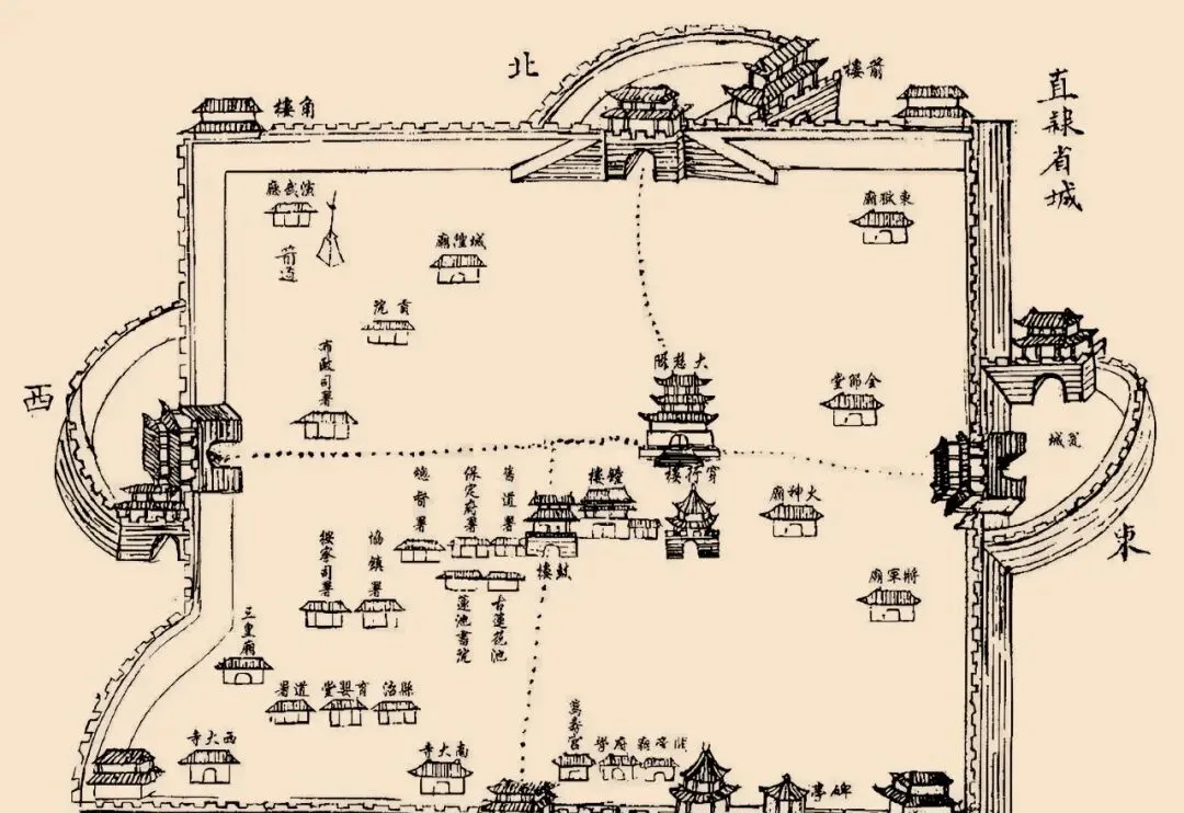 图中这张手绘图叫直隶省城全图,黑线勾勒出四门八楼,注着望瀛、迎薰、瞻岳、拱极的老名号,中心一座高阁像钉子似的定在城脊上,老一辈说看这图走城不迷路,哪条街出东门,哪条巷拐去府学,背两天就熟了。