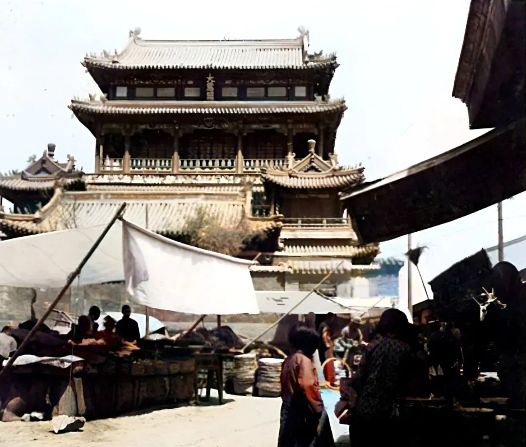 画面里金瓦重檐的是大慈阁,檐角挑着兽吻,前头搭着遮阳的白布,摊贩在底下支锅卖食,香味顺着风蹭人脸,奶奶常说庙前的集最好逛,买点饼子,抬头还能给佛爷作个揖。