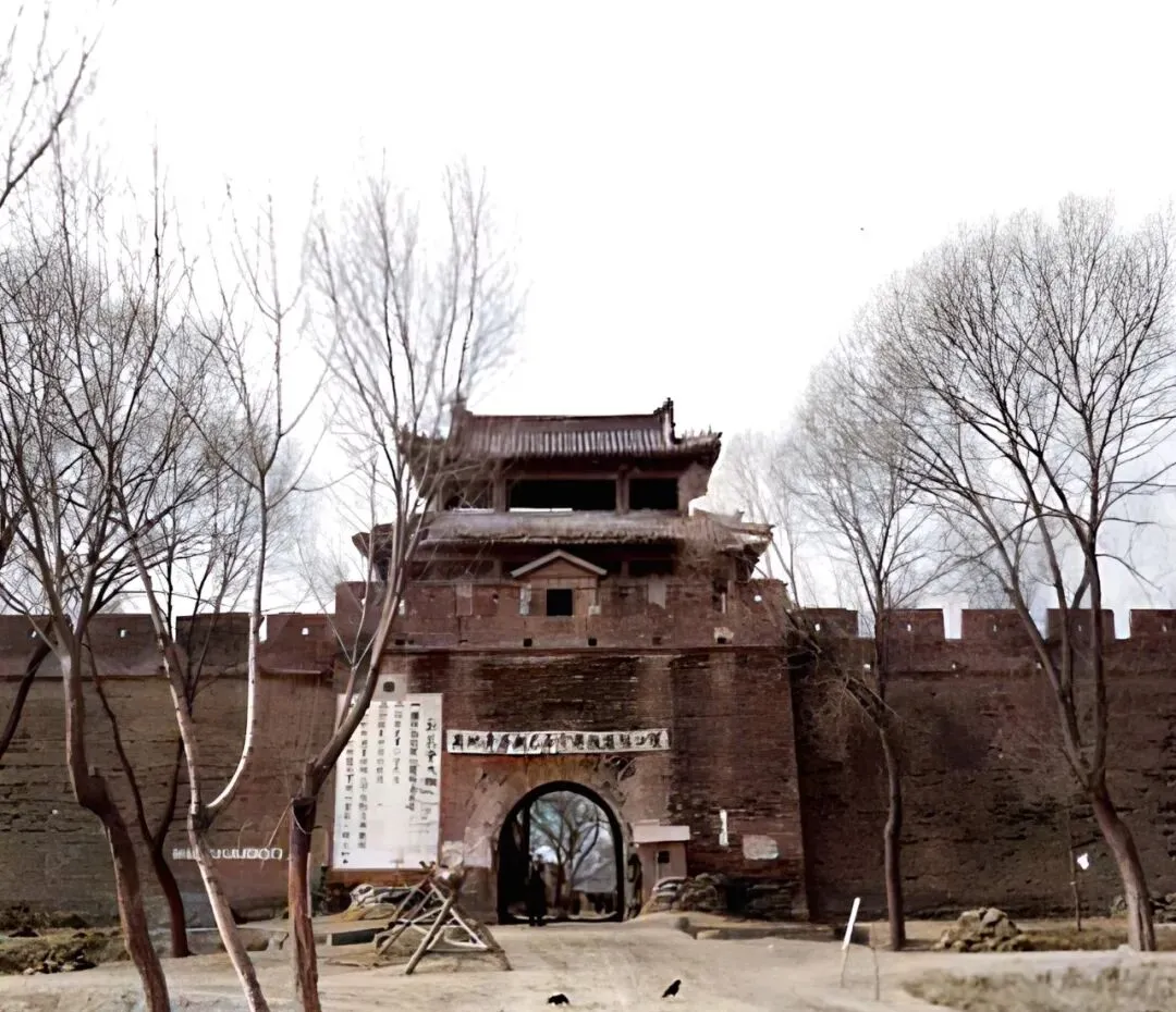 这幢砖红色的城楼立在冬天的冷风里,树杈光秃秃,门匾上书着门名,墙根处贴着告示,谁家丢了牲口,谁家招短工,都能在这儿打听到,老城墙到四十年代末渐渐拆了,现在只剩下一段,还被人当宝似的看护着。