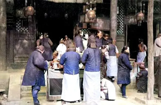 这处茶摊挤挤挨挨,一碗盖碗茶端来热雾腾起,几个人围着案板吃点心,掌勺的抡勺飞快,端盘的小伙子嘴里应声得嘞,庙会天就是这样,一碗热茶下肚,脚下就不困了。