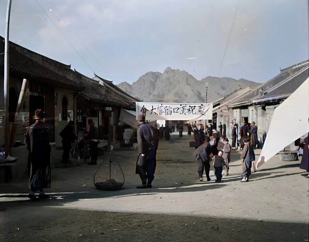 这张是古北口的老街,土路宽又直,两排店面门脸不高,横杆上拉着条幅,街口有秤杆和担子,孩子们追着跑,大人抿着烟袋锅子说价钱,以前热闹靠集市,现在一到节假日热闹是游客。