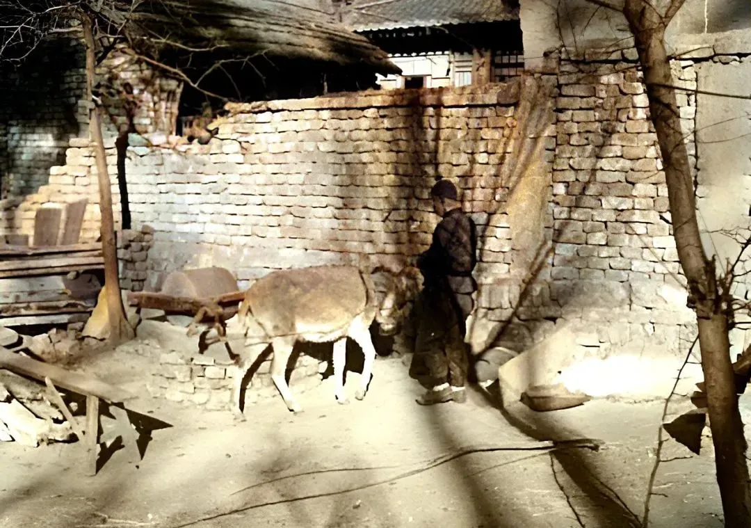 这幅里的人牵着驴,院角里靠着石碾和木杠,墙是粗砖垒的,影子把地面切成一块块,奶奶笑过我,说你小时候非要坐到碾盘上转一圈才肯下来,转完一身土,乐得直咯咯。