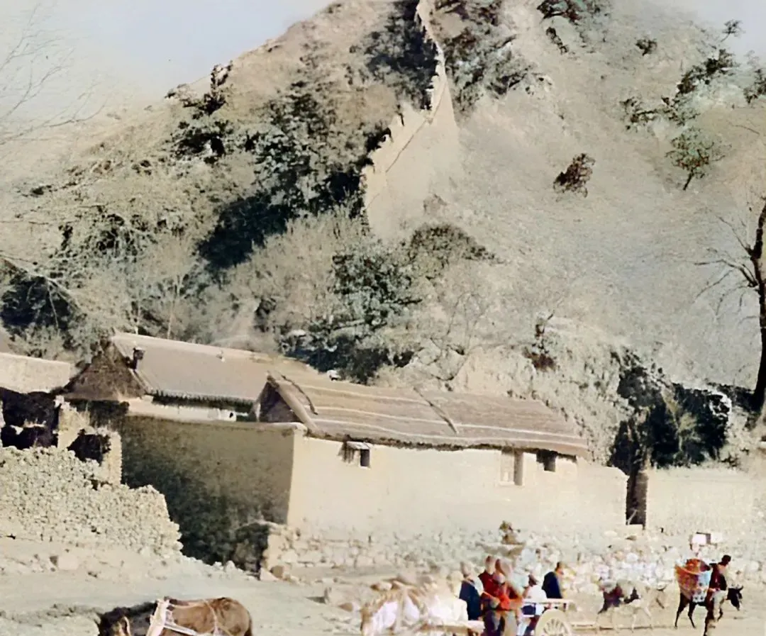 靠山的这几间土坯房,屋面用草泥抹得圆润,屋前一队车马赶着货物,山梁上露出城墙的一截,像从树梢里伸出手指,现在的村子该修成了青砖灰瓦,但这份贴着山体的安稳劲儿还在。