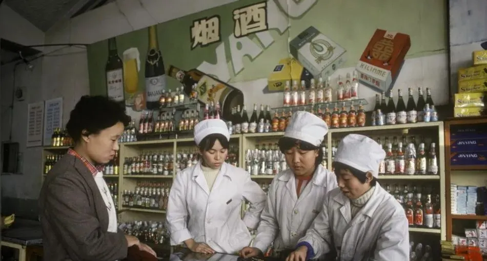 图里这排玻璃柜叫供销社前台,白帽子售货员手里拿算盘,顾客得先把票和钱一齐递上去,酒水一瓶瓶排得齐整,过去买个肥皂都得排队,现在手机一点啥都有了。