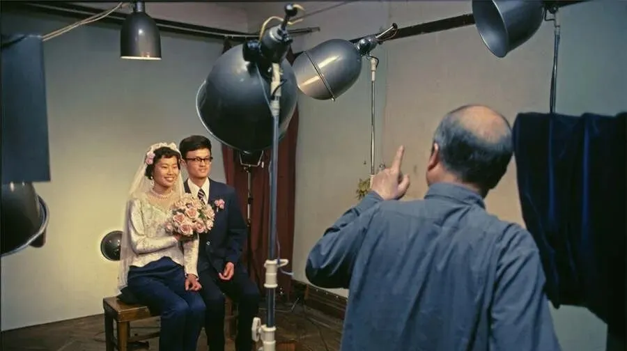 这个布景叫照相馆棚,钨丝灯往脸上一照就暖,摄影师手指一竖喊别眨眼,新郎西装打挺,新娘手握花束腼腆一笑,老式快门“喀嚓”一响就把幸福定住了。