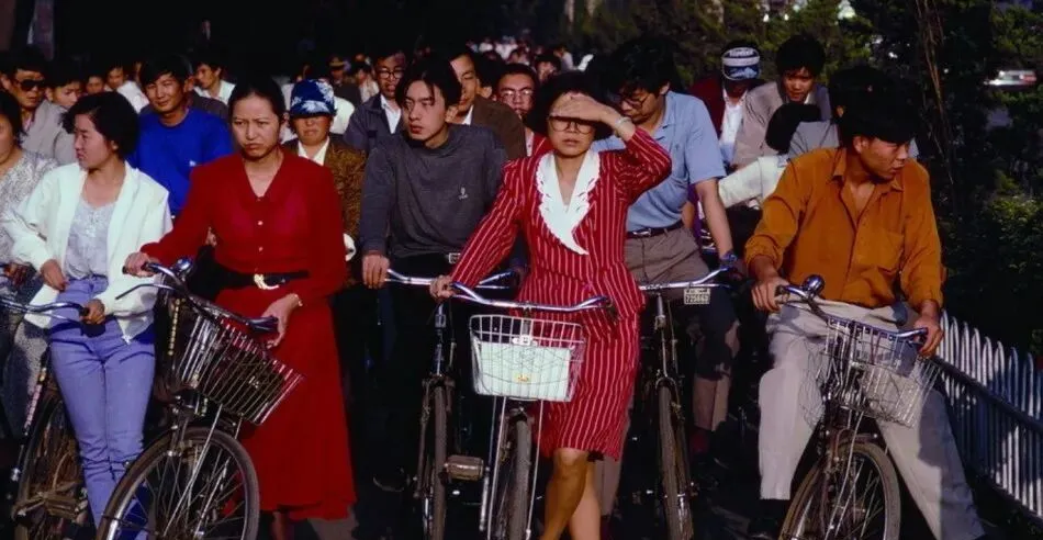 图中这一片叫自行车潮,永久凤凰一辆挨一辆,链条“吱呀”唱着合唱,谁能想到后来人人手里一部手机,脚下却越来越少踩脚蹬的力气。