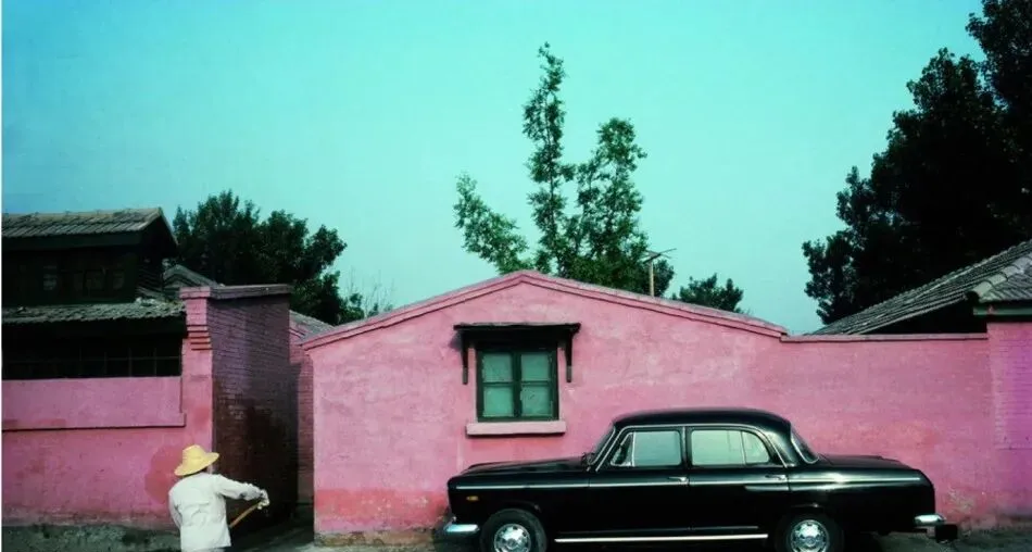 这条小巷墙面刷成玫红色,老款红旗蹲在一旁,环卫大爷拿扫帚“沙沙”地扫,颜色鲜到晃眼,照片一看就开心。