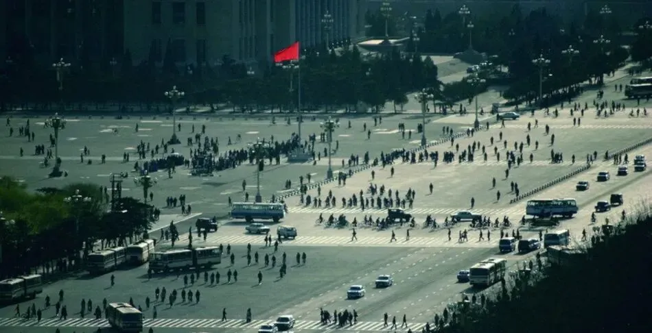 这片开阔地是市民散步的好去处,红旗在风里抖,公交车排成细线,人影像棋子一样散开,远远看去心就定了,城市正一点点长大。