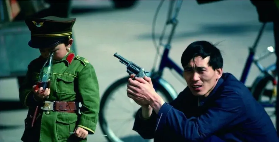 孩子身上这套是小号军装,铜扣一粒粒亮堂,爸爸蹲在旁边拿把玩具左轮比划着,孩子拿汽水瓶咕嘟咕嘟喝得直眯眼,父子俩的默契就装进这一张照片里了。