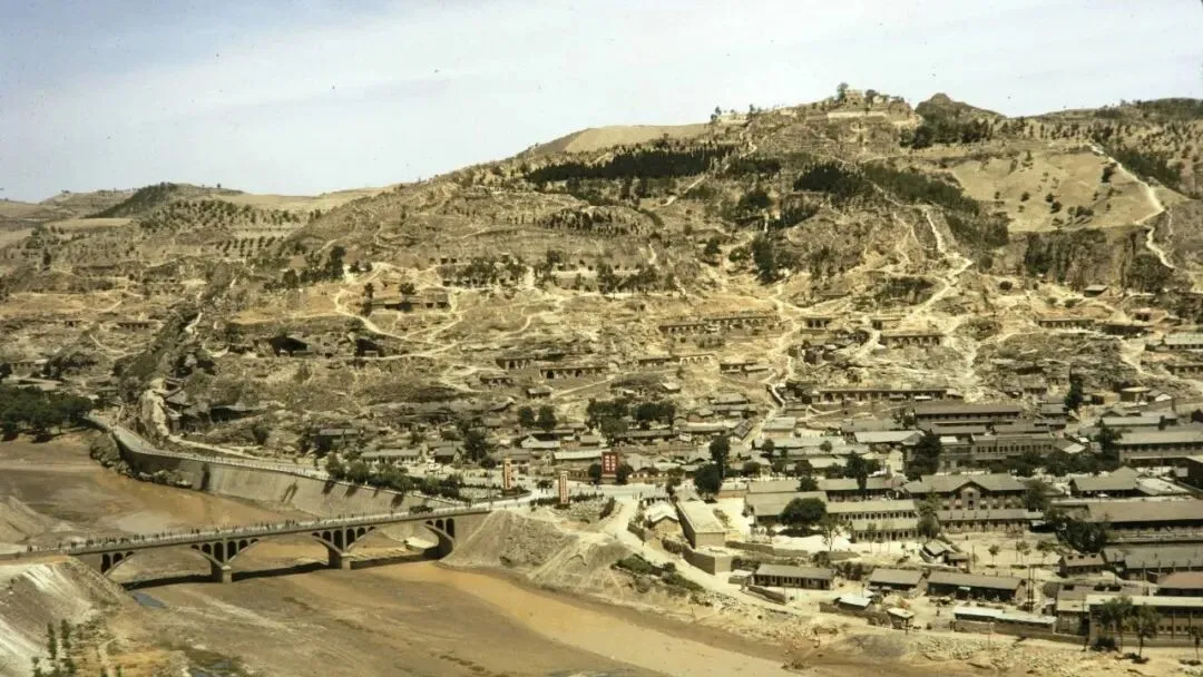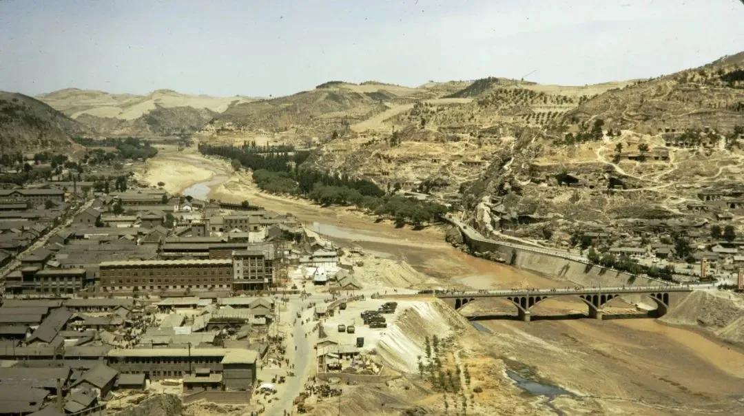 图中这一湾就是延河,桥身是当年的老大桥,拱孔一连几个像把弓,河滩上车辙清清楚楚,城里街巷从桥头分开,成了两条脊梁撑住了整座城。