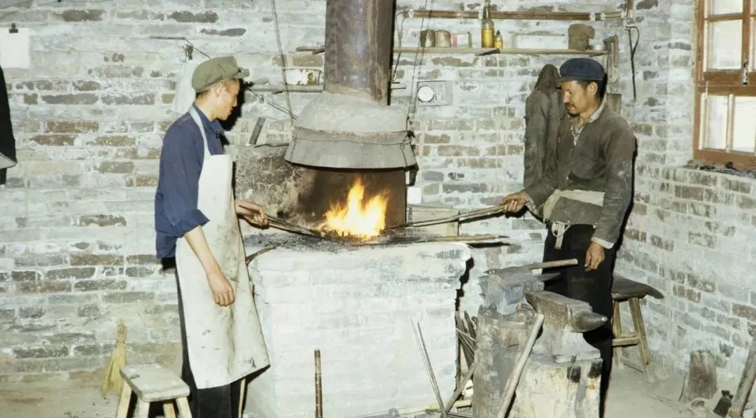 图中这个就是铁匠铺,火嘴“呼呼”吹,炉心一团白亮,师傅抡起锤子打在铁胚上,“当当”回声在墙上滚,打镰刀打锄头,春上全村都要来排队。
