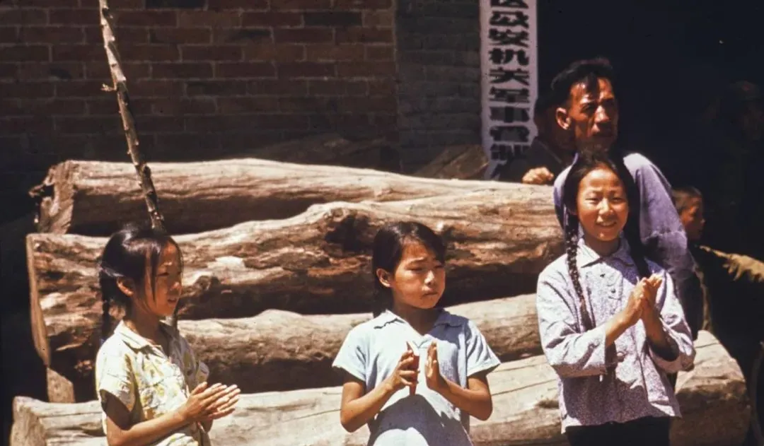 这仨小姑娘把手心拍得红红的,背后堆着大木头,可能是代表团来了,叔叔说那会儿合影要站得端正,笑也要收着点。