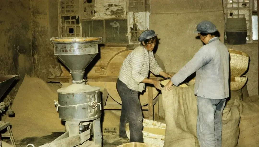 这个老式磨面机是金属桶,侧面有铭牌,女工把口袋扶正,白面像瀑布一样灌进去,抬头一看眼睫毛都糊了白粉,她们就笑笑,抹一下接着干。
