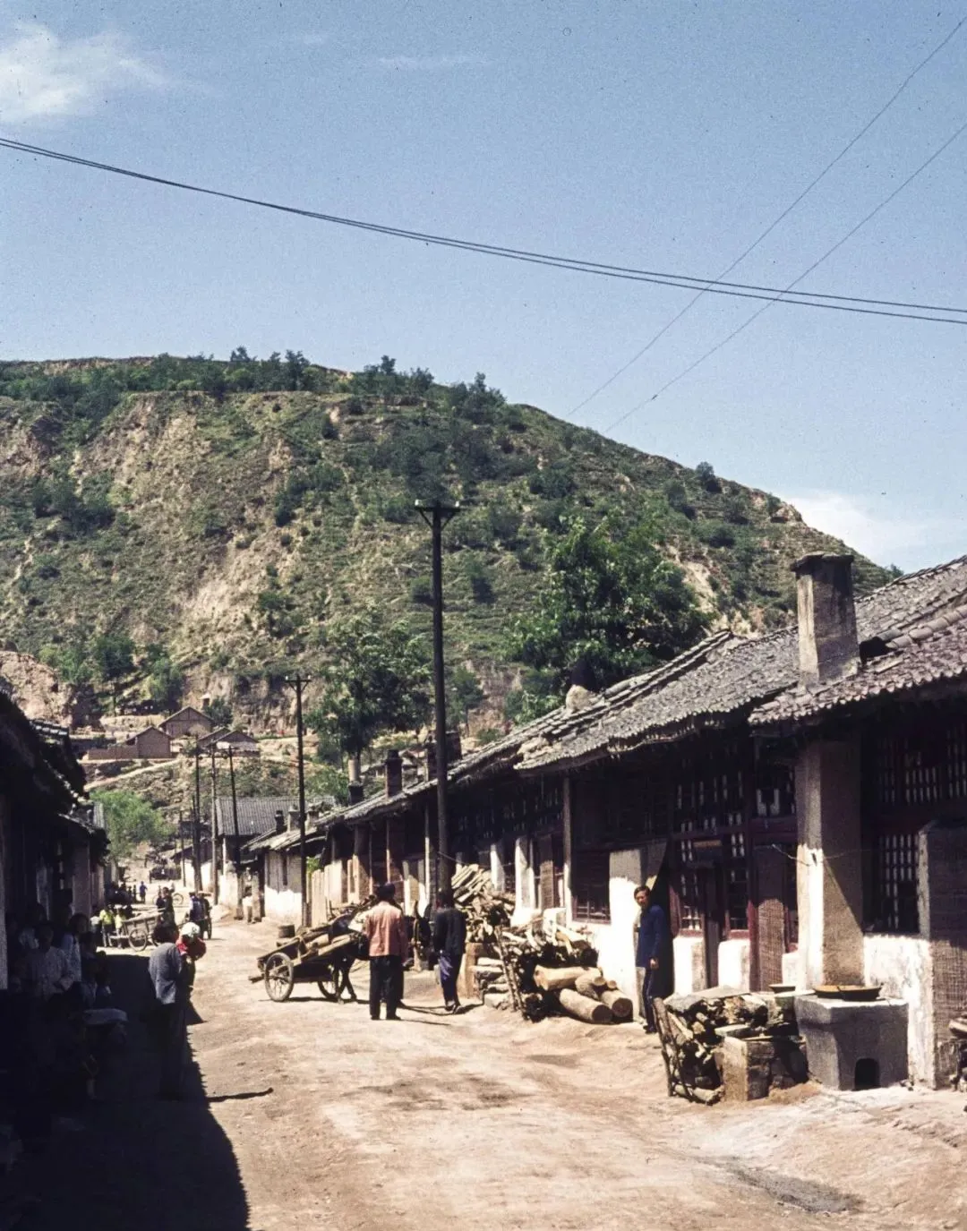 这个坡面像切开的糕,最上头是老松树,下面一层层窑洞带着檐口,雨后一晒有股泥土甜味,孩子们从洞口蹿出来,鞋底儿印在土路上排成行。