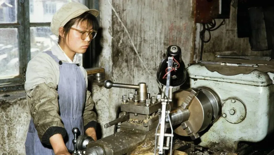 这个车床老得很,手柄油亮,姑娘戴着眼镜盯着刻度,刀尖一点点往里吃,耳边嗡嗡直响,她抬手抹了把额头,黑油印在护目镜边上。