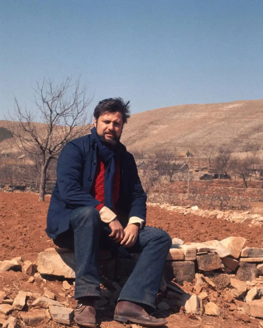 这个坐在石头上的客人是来考察的外国朋友,穿着呢子围巾,脚下是乱石,身后是春寒料峭的荒坡,村里人爱招呼客,端碗热茶递过去,笑着说“地硬不怕,手勤地就服软”,一句话把门面撑住了。