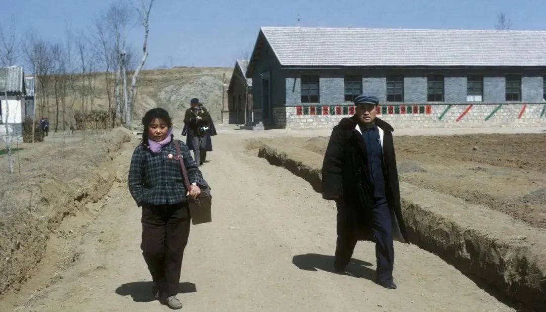 这条笔直的土路通向青砖房,就是村里的学校和大队部,墙根贴着红绿相间的标语画,女孩子背着书包在风里走得飞快,男人穿着棉大衣踩着咯吱作响的冻土,路虽土,心是新的。