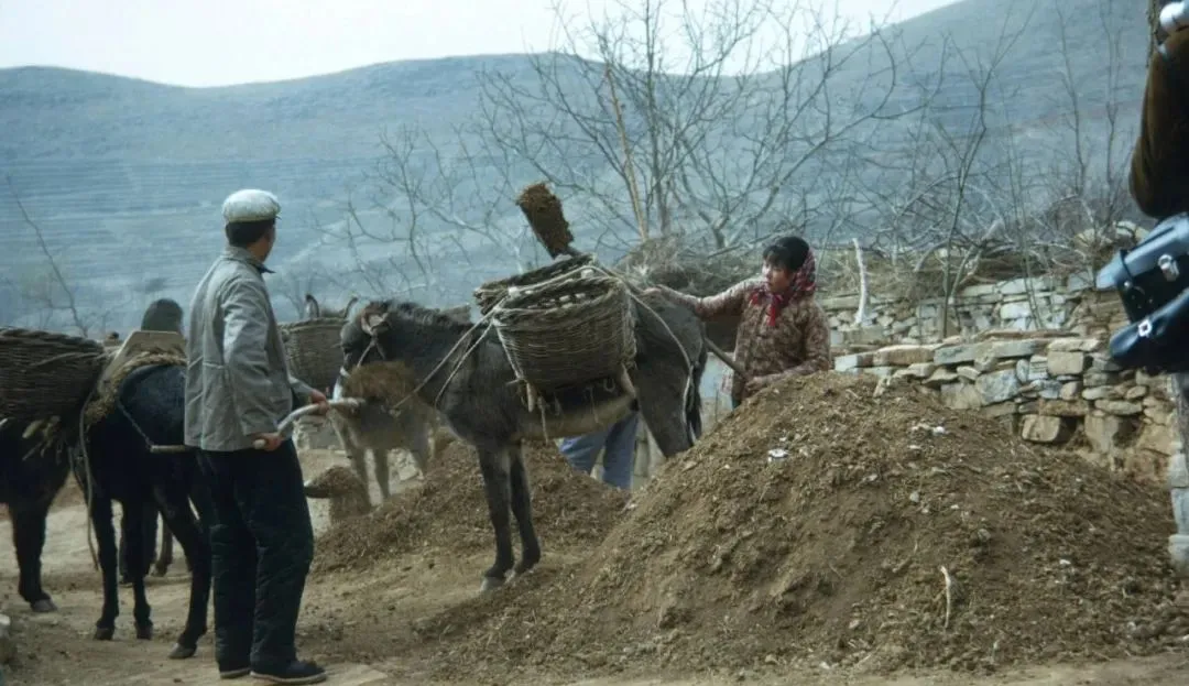 图中这活儿叫驮粪上地,柳条编的大筐压在毛驴背上,女社员一手拽缰一手扶筐,男人用木锨把粪拍得实,走到地头再一兜一兜摊开,妈妈说那时没有化肥,全靠这个“黑油”喂庄稼,春风一过,地里就有了味道。