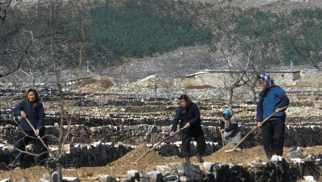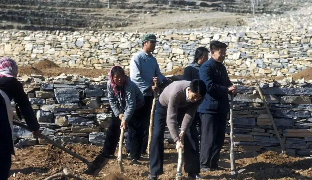 这一圈围坐在地里的,就是干完活儿开小会,围脖、棉帽、红脸蛋围成一圈,你一句我一句,商量明儿怎么修第二道坎,短平快,散会就上锄头,没废话,这作风现在看都利落。