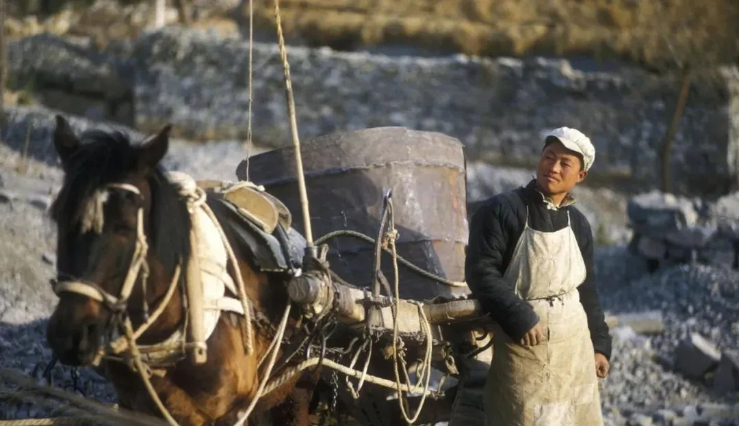 这个皮垫叫套包子,卡在马肩上护肉的,前头牵着缰,车上坐着大铁镬,满满装着石子,师傅抬头看了一眼坡道,手上把绳往后一勒,马喷一口白气就上去了。