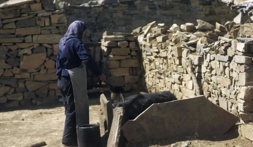 这里是牲口棚的后院,石墙围着,屋里拴着驴马,汉子拿着笤帚打扫圈舍,妇女蹲在地上修具,地上散着麦秸,阳光斜斜照下来,尘土里都带着暖味。