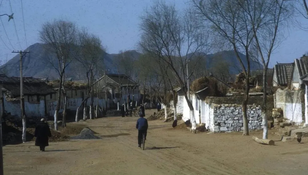 大路两旁刷白的杨树排成队,土街宽,骑车的人从中间蹬过去,墙上口号一溜排着,路边堆着柴草垛,鸡在土里刨食,日子慢,可脚下不偷懒。