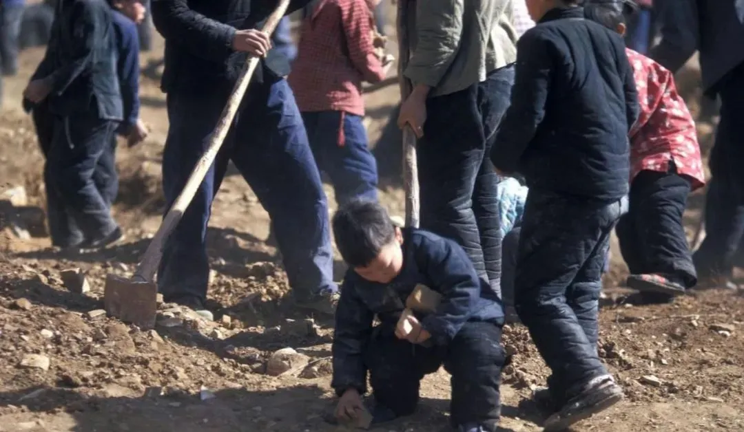 大人挥着镢头起石块,小孩蹲在边上捡小疙瘩往筐里装,锄把打在地上“咣咣”脆响,阳光把尘土照成金色,谁家也没闲着,连袖口都卷到胳膊肘上了。