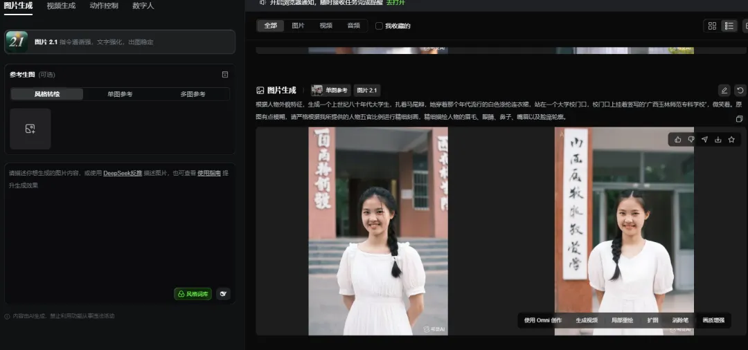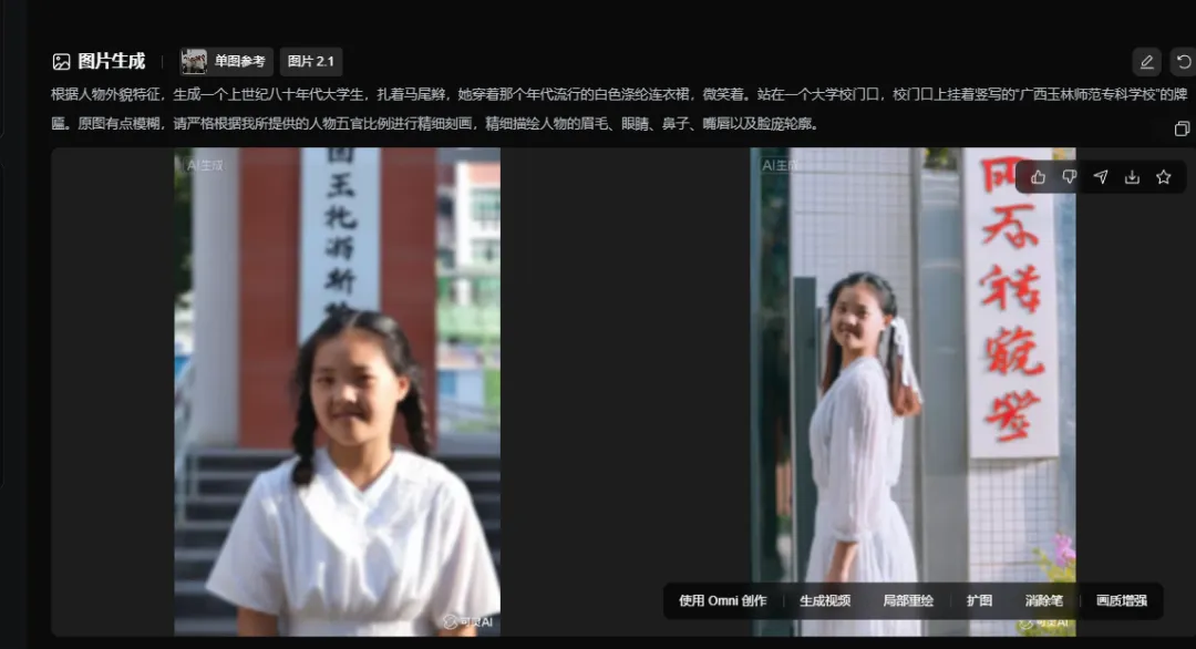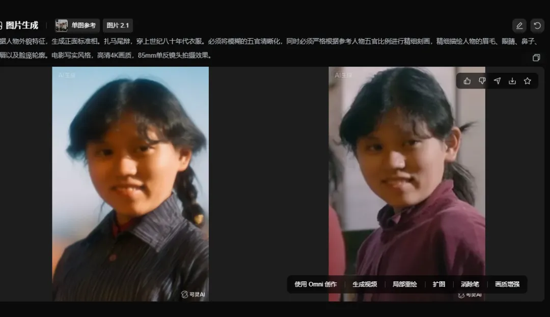 原来的照片只有171KB,放大来看,像素极低,人物五官只可依稀辨认。这几天我突发奇想,是否可以用AI修复并放大?毕竟,谁不想看看当年青春年华的自己。于是我马上行动,先用PS、再用即梦、后用可灵,复用豆包,几种软件来回折腾(当然这其中消耗了我极多的积分,这可是真金白银的“曼尼”啊)。还好,年关近了,AI界突然放大招,豆包突然甩出最新版