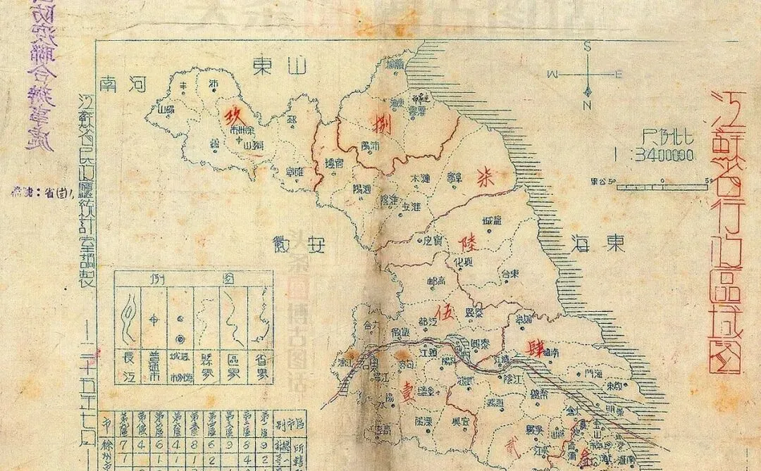 这个发黄的纸面叫民国三十五年江苏行政区域图,红线勾出江河,蓝字标着州县,角落里还有小小的比例尺和图例,折痕像时光留下的指纹,以前读书背地理靠它,现在手机一放大就能看清乡道,味道可就不一样了。