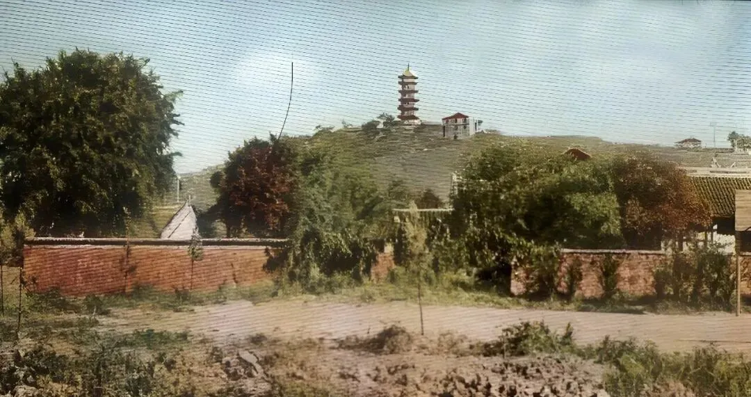 这座高挑的楼阁叫北寺塔,层层檐角翘着,像把扇子一折一折挑起来,近处是红漆门楼和青瓦回廊,风一过,铜铃叮的一声,奶奶说庙会那天人多得很,香火直冲天。